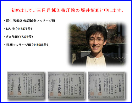 初めまして。三日月鍼灸指圧院の坂井博和と申します。
